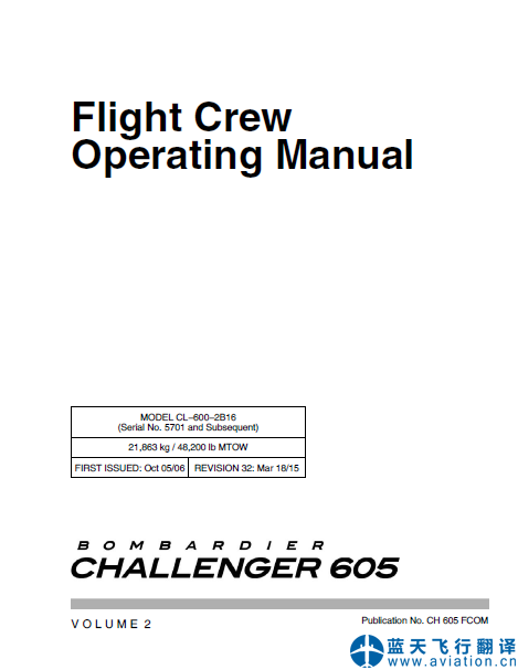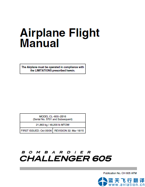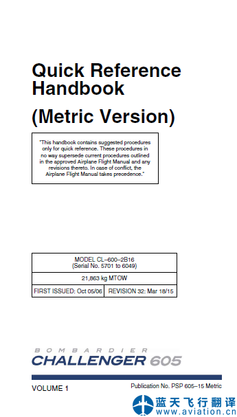 北京藍(lán)天飛行翻譯公司完成大型公務(wù)機公司的第32版/2015年3月18日版本龐巴迪挑戰(zhàn)者605全套飛行手冊翻譯任務(wù):第32版龐巴迪挑戰(zhàn)者605飛機飛行手冊、機組操作手冊、快速檢查單 Revision 32 Mar 18/15 Bombardier Challenger 605 Airplane Flight Manual, Flight Crew Operating Manual, Quick Reference Handbook Translation