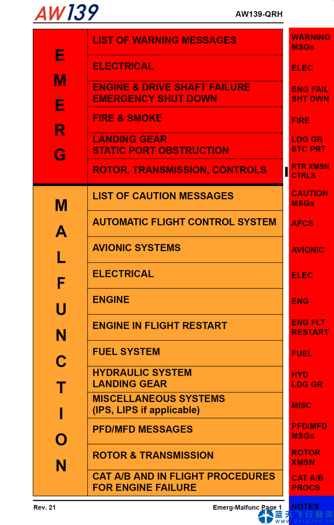 AW139直升機快速檢查單(Quick Reference Handbook(QRH))的主要內容包含有: