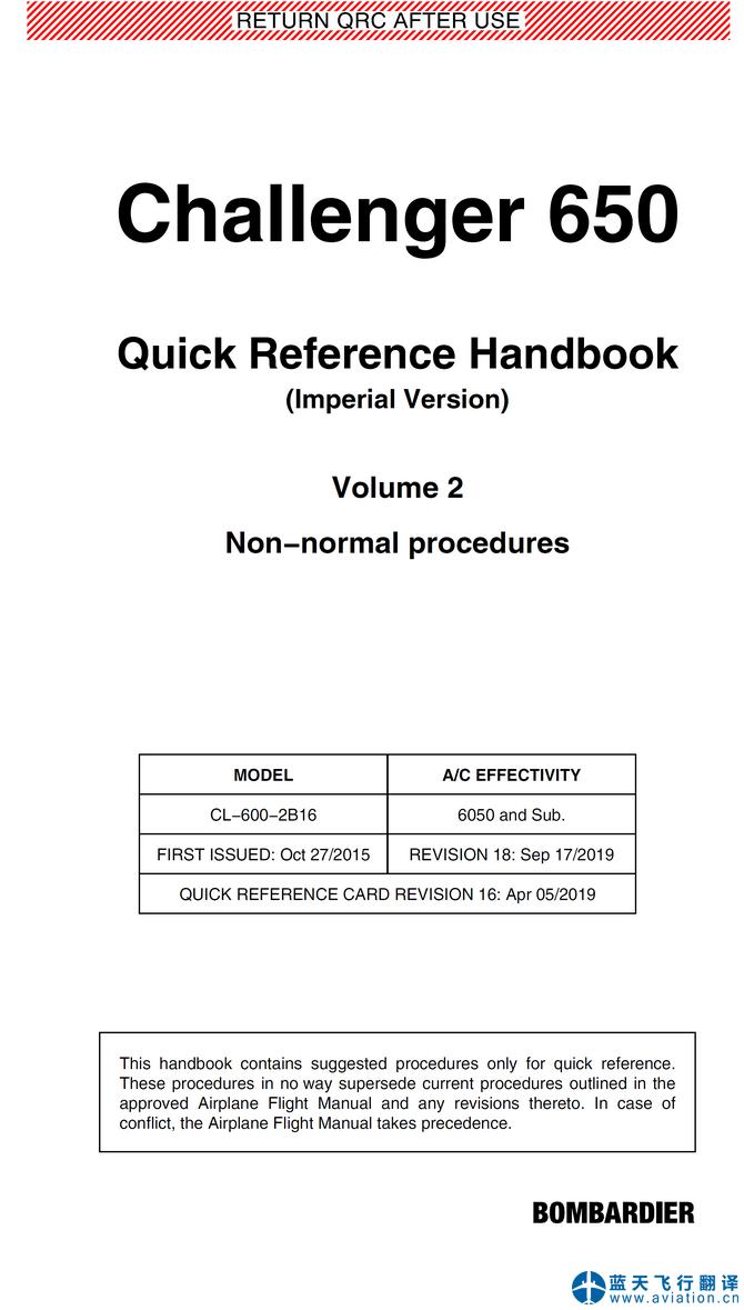 北京藍天飛行翻譯公司承接公務機公司龐巴迪挑戰者650全套飛行手冊翻譯任務 Bombardier Challenger 650 Flight Manuals Translation 本次承接的龐巴迪挑戰者650公務機飛行手冊有:挑戰者650飛行機組操作手冊(CL650 Flight Crew Operating Manual)、挑戰者650快速檢查單(CL650 Quick Reference Handbook)和挑戰者650飛機飛行手冊(CL650 Airplane Flight Manual)。版本日期為2019年9月17日第18版 REVISION 18: Sep 17/19。  挑戰者 650 Challenger 650  挑戰者 650 Challenger 650  挑戰者 650 Challenger 650  挑戰者 650 Challenger 650