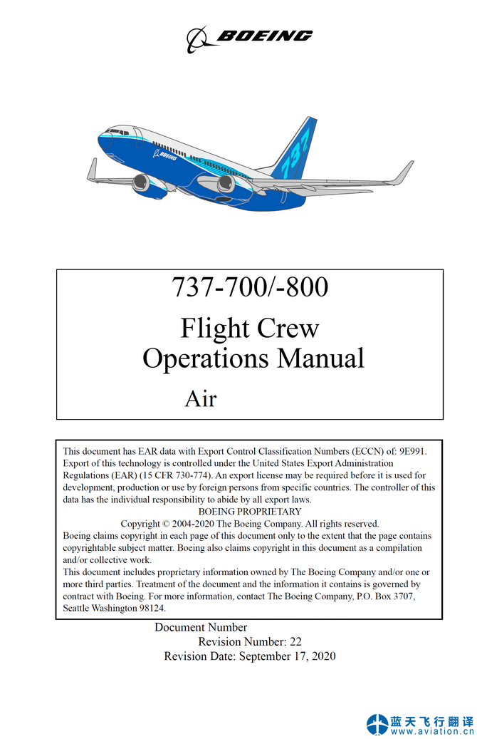 北京藍(lán)天飛行翻譯公司本次翻譯的737-700/-800飛行機(jī)組使用手冊(cè)、快速檢查單和飛機(jī)飛行手冊(cè)修訂日期為2020年9月17日,為最新版手冊(cè),總共包含5架飛機(jī)。