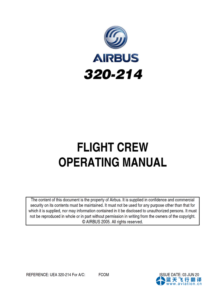 北京藍天飛行翻譯有限公司完成大型航空公司2020年6月3日版本空客A319/A320飛行機組操作手冊、快速檢查單和飛機飛行手冊翻譯任務 A319/A320 FLIGHT CREW OPERATING MANUAL, QRH QUICK REFERENCE HANDBOOK and AIRPLANE FLIGHT MANUAL Translation