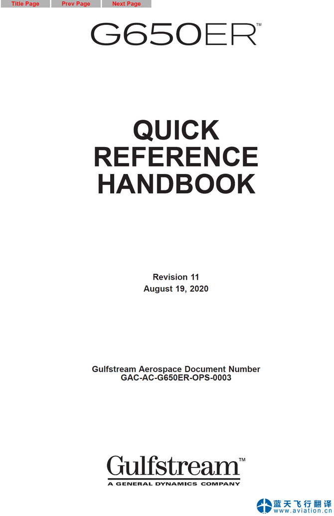 北京藍(lán)天飛行翻譯公司完成大型公務(wù)機(jī)公司的2020年8月19日版本灣流G650ER快速檢查單翻譯任務(wù) Revision 11 August 19, 2020 G650ER QUICK REFERENCE HANDBOOK Translation